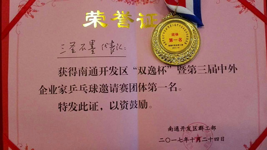 10月24日,三圣石墨代表隊(duì)參加南通開發(fā)區(qū)“雙逸杯”暨第三屆中外企業(yè)家乒乓球邀請賽,通過一天的緊張角逐,過關(guān)斬將,最終在24支代表隊(duì)中脫穎而出,獲得本次比賽冠軍。