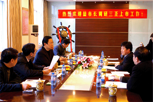 日前,南通市常務(wù)副市長藍紹敏率領(lǐng)市發(fā)改、經(jīng)貿(mào)等部門主要領(lǐng)導,到三圣公司調(diào)研上市工作,公司董事長馮圣君及部分高管陪同調(diào)研。